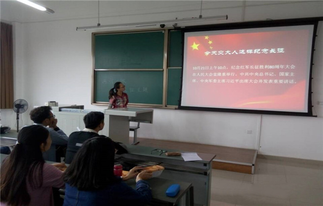 在介绍长征背景和过程的时候,支部书记结合“长征记忆”小视频,生动地讲述了革命红军在那个危难时刻艰苦卓绝的奋斗精神。之后,易小莹解读了10月21日在人民大会堂举行的纪念红军长征胜利80周年大会上习近平总书记的讲话,为在场的党支部成员概括讲述了四个“伟大远征”、五点“长征精神”以及走好长征路的六个方面的要求。另外,易小莹还给大家讲解了全面建成小康社会新目标和新要求,她讲到