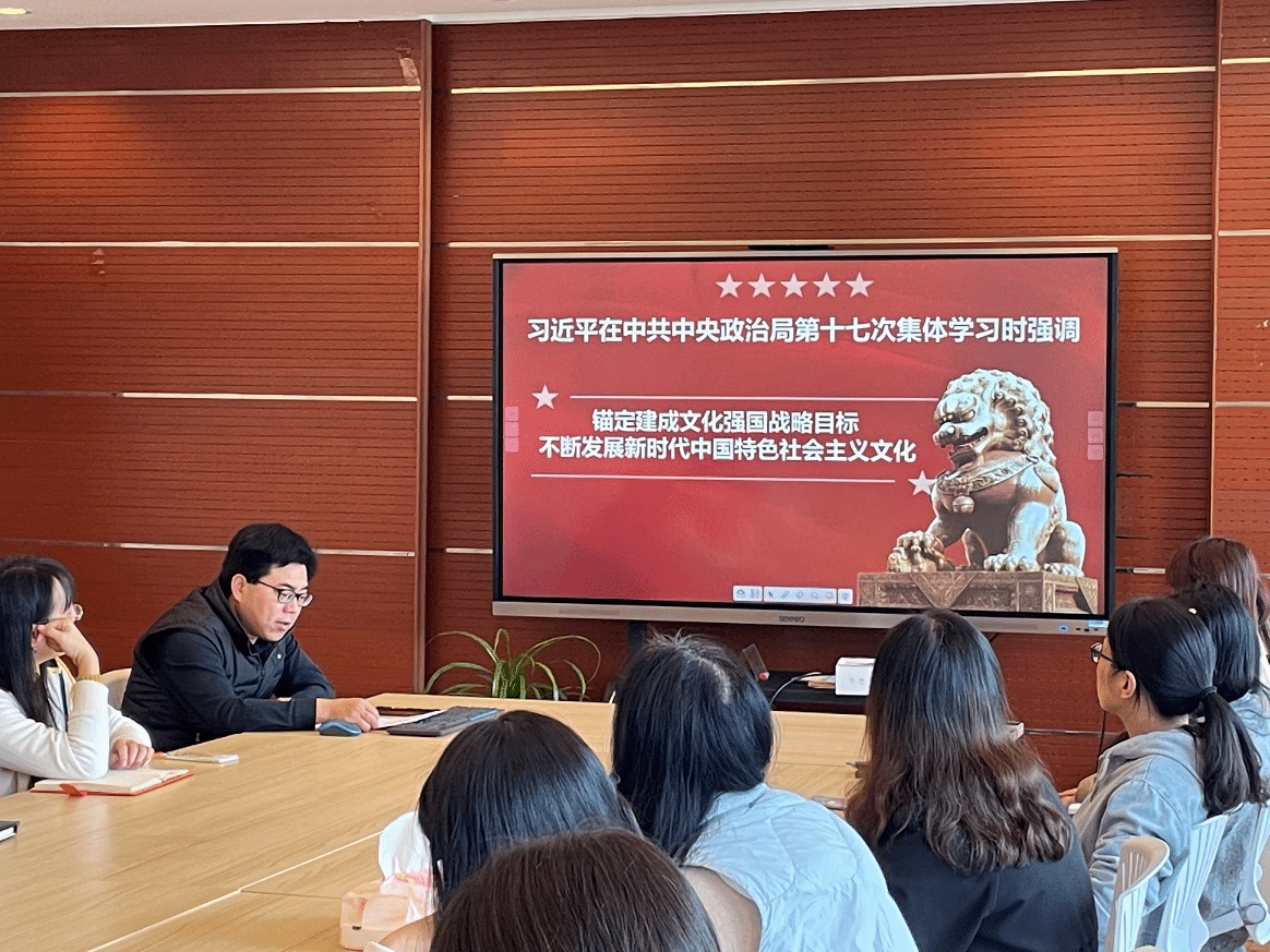 教工行政党支部和机关全体教职员工围绕中共中央总书记习近平在主持中央政治局第十七次集体学习时强调的,要锚定2035年建成文化强国的战略目标,坚持马克思主义这一根本指导思想,植根博大精深的中华文明,顺应信息技术发展潮流,不断发展具有强大思想引领力、精神凝聚力、价值感召力、国际影响力的新时代中国特色社会主义文化,不断增强人民精神力量,筑牢强国建设、民族复兴的文化根基这一论述,开展学习。