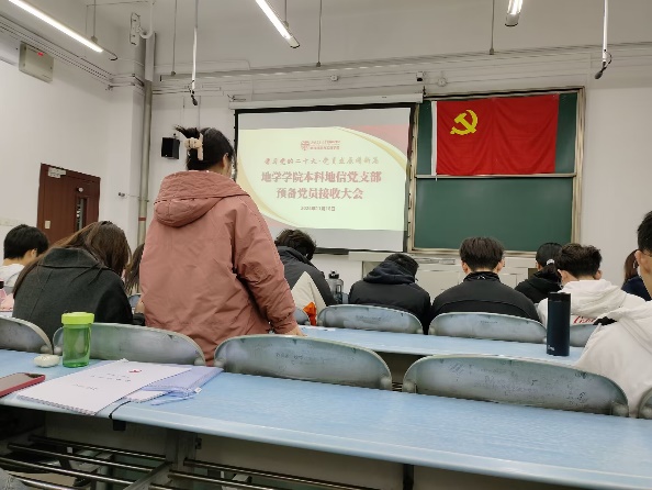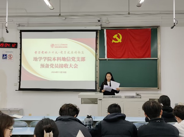 为进一步加强党支部队伍建设工作,切实提高党员发展对象综合素质,严把党员发展质量关,充分发挥党员先锋模范作用和党组织战斗堡垒作用,地学学院本科地信党支部于2024年11月18日晚上19时00分在X2331召开2024-02期预备党员接收大会,本次大会的议题:讨论是否同意接收黄龄诺、石嘉馨、王艺诺、张智睿4名同志为预备党员。本次大会由候王悦同志主持。