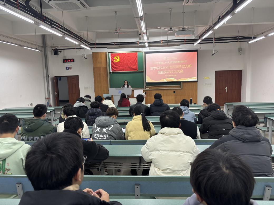 地学学院本科地质资勘党支部于2024年12月29日16时30分在X4155召开2023-02期预备党员转正大会,审议、讨论、表决关于预备党员乔彦博、赵高伟、李骁群、王国英、廖望、朱梓宁共6名同志转为中共正式党员的相关事宜。本次大会由本科地质资勘党支部书记刘伟婷同志主持。本科地质资勘党支部共有党员33名,今天出席会议的党员28名。有表决权的正式党员应到会12名,实到会9名。人数超过应到会人数的一半,符合组织规定,大会有效。