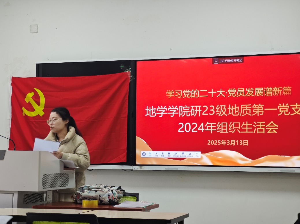 随后,支部书记王睿同志围绕支部在2024年度开展的工作内容以及支部成员的批评与自我批评内容进行总结。过去一年,在上级党委的坚强领导下,研23级地质第一党支部紧紧围绕学校和学院的中心工作,认真履行职责,扎实推进各项工作。研23级地质第一党支部积极开展主题党日活动,加强党员教育管理。但工作中还存在一些不足,如党员教育形式还不够丰富多样,对部分党员的思想动态掌握还不够全面深入等。在今后的工作中,研23级地质第一党支部将进一步加强自身建设,创新工作方法,提高工作质量,更好地发挥党支部的战斗堡垒作用和党员的先锋模范作用。随后,王睿同志总结了支部成员自身存在的问题主要在学习不够积极主动,政治理论学习不够深入和志愿服务活动参与度不高几个方面,支委会将会在之后的学习生活中围绕以上几个方面开展引导式教育类活动和服务实践类活动,帮助支部同志改进不足。大家在发言中,本着对党负责、对同志负责、对自己负责的态度,实事求是地进行自我剖析,诚恳地提出批评意见,共同营造了团结、和谐、奋进的良好氛围。