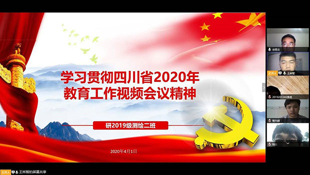 3 月 27 日,四川省教育工作视频会议在成都召开。会议传达了四川省委常委、宣传部部长甘霖同志,副省长杨兴平同志有关批示精神,并就2020年四川省教育工作作出全面部署。为深入贯彻学习本次会议传达的各项讲话精神,4月1日晚7点,地学学院研19级测绘2班党支部召开支部大会,大会宣读了省委常委、宣传部部长甘霖同志和省政府副省长杨兴平同志对全省教育工作的批示精神,学习了省委教育工委书记,教育厅党组书记,厅长李江同志以及省委教育工委副书记李光华同志的讲话精神。会议利用腾讯会议平台在线召开,由党支部书记王所智同志主持。