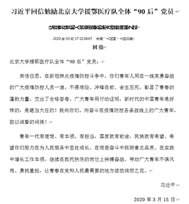 会议第二阶段,邓嘉琳等三位同志都分别对信中的内容说出了自己认为最深刻的句子,表达了对习近平总书记回信的体会感悟,以及对疫情期间医护人员的敬佩和赞美。习近平总书记在给北京大学援鄂医疗队全体90后”党员的回信中写道:“广大青年用行动证明,新时代的中国青年是好样的,是堪当大任的!”这让全国高校青年师生倍感振奋、备受鼓舞,激励着广大青年勇挑重担,为打赢疫情防控阻击战贡献力量,让青春在党和人民最需要的地方绽放绚丽之花。