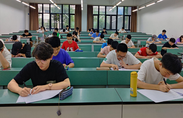 七点,监考员分发试卷,考场负责人站在讲台上看着整体考试情况,另外会有两名同学进行巡逻式监考,十分注重考场纪律,绝不放过一个违反考试规则的人,对作弊行为绝不姑息,测试中同学们埋头认真答题,都希望自己可以在测试中获得较好的成绩,早日成为发展对象而努力。有些同学对内容十分熟悉,自信满满提前离开交卷,有些同学稳扎稳打,慢慢琢磨题目,不放过任何一个得分点。