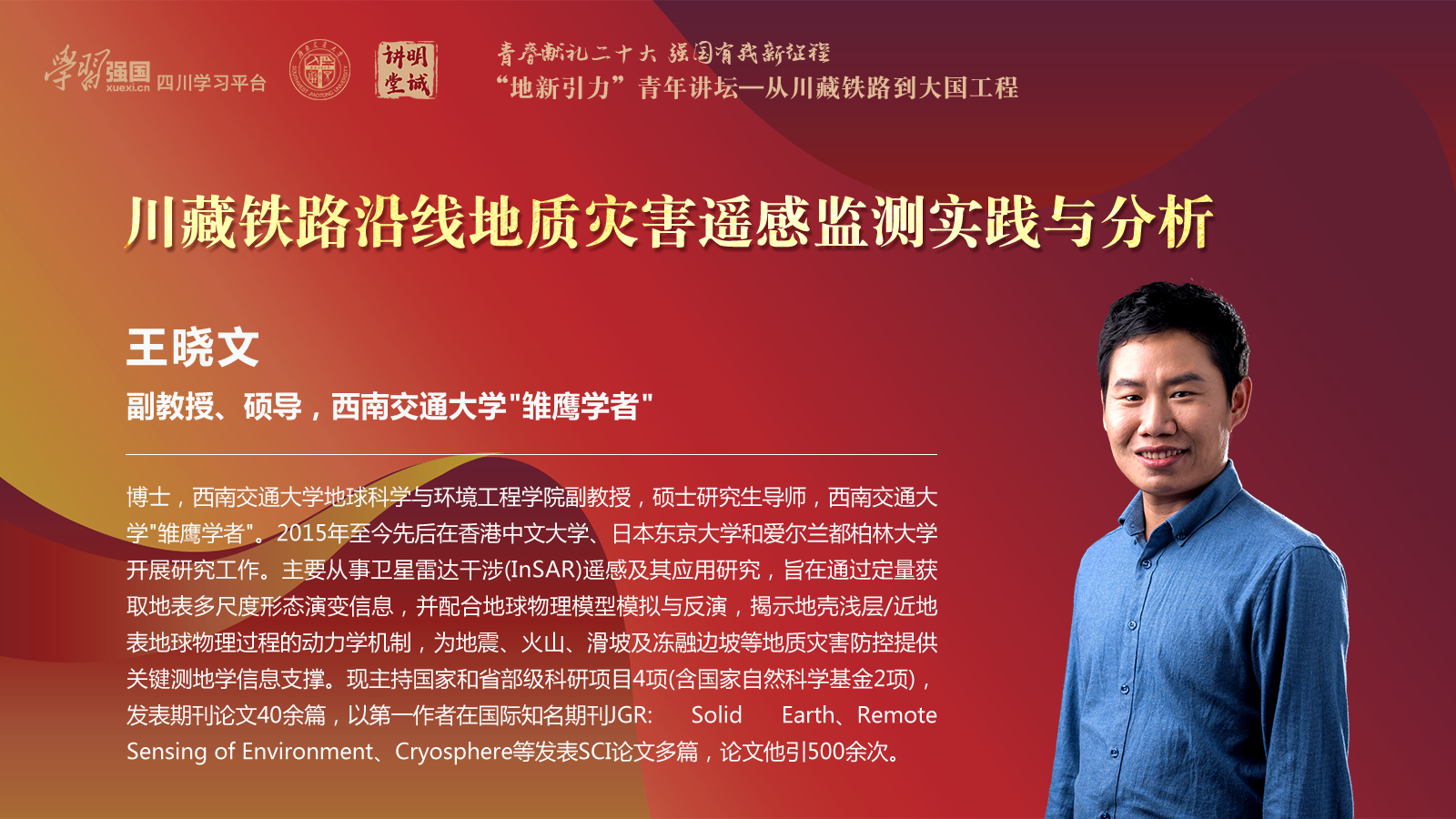 为引领广大青年学生积极投身川藏铁路建设和服务的伟大实践中,充分发挥地学学科优势,特邀请川藏铁路建设一线的专家、学者与优秀青年学生为全院(校)学生开展系列专题讲座,旨在喜迎二十大的关键时间点,充分做好爱党、爱国的思想政治教育,号召学生将小我融入大我,青春献给祖国。由学习强国四川平台、校党委宣传部、校团委以及地学学院联合主办的“地新引力”青年大讲堂——“从川藏铁路看大国工程”系列讲座第四期即将开始。现就相关通知如下: