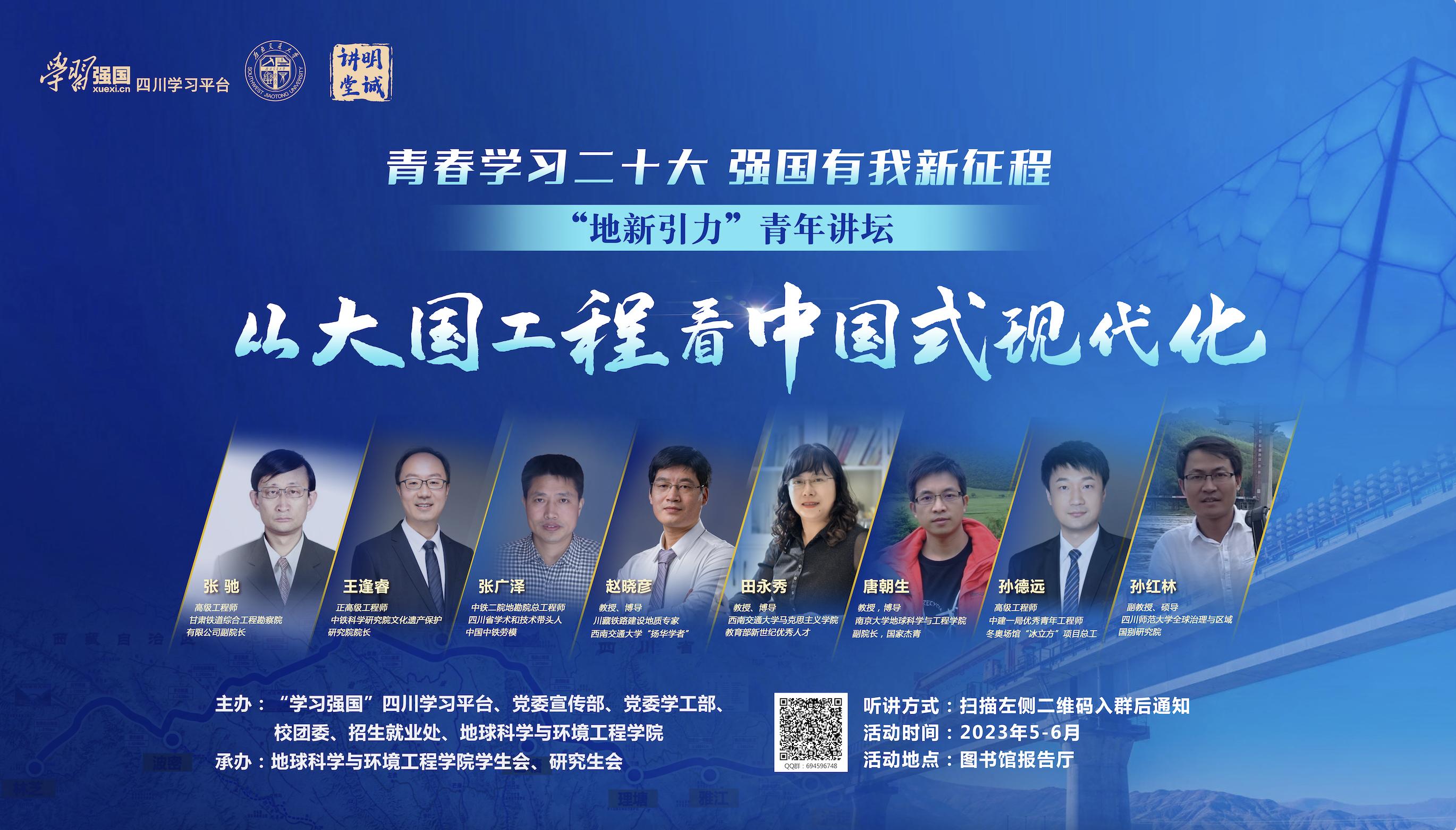 为学习宣传贯彻党的二十大精神,充分发挥学校轨道交通相关学科优势,引领广大青年学生将小我融入大我,以青春实践奉献祖国,在新时代新征程中奋勇争先建功立业,使青年一代在大国工程一线受教育、长才干、做贡献。地学学院在“学习强国”四川学习平台、党委宣传部、党委学工部、校团委以及招生就业处的支持下,邀请了大国工程一线以及思想政治教育与人文社科领域的专家、学者、教授为主讲嘉宾,通过“地新引力”青年讲坛的方式,为青年学生解惑授业、增知识、长才干,号召广大学生立志做有理想、敢担当、能吃苦、肯奋斗的新时代好青年。2023年5月4日,值此青年节之际,“地新引力”青年讲坛——“从大国工程看中国式现代化”开讲仪式暨专题一、专题二讲座即将开始,现就相关通知如下: