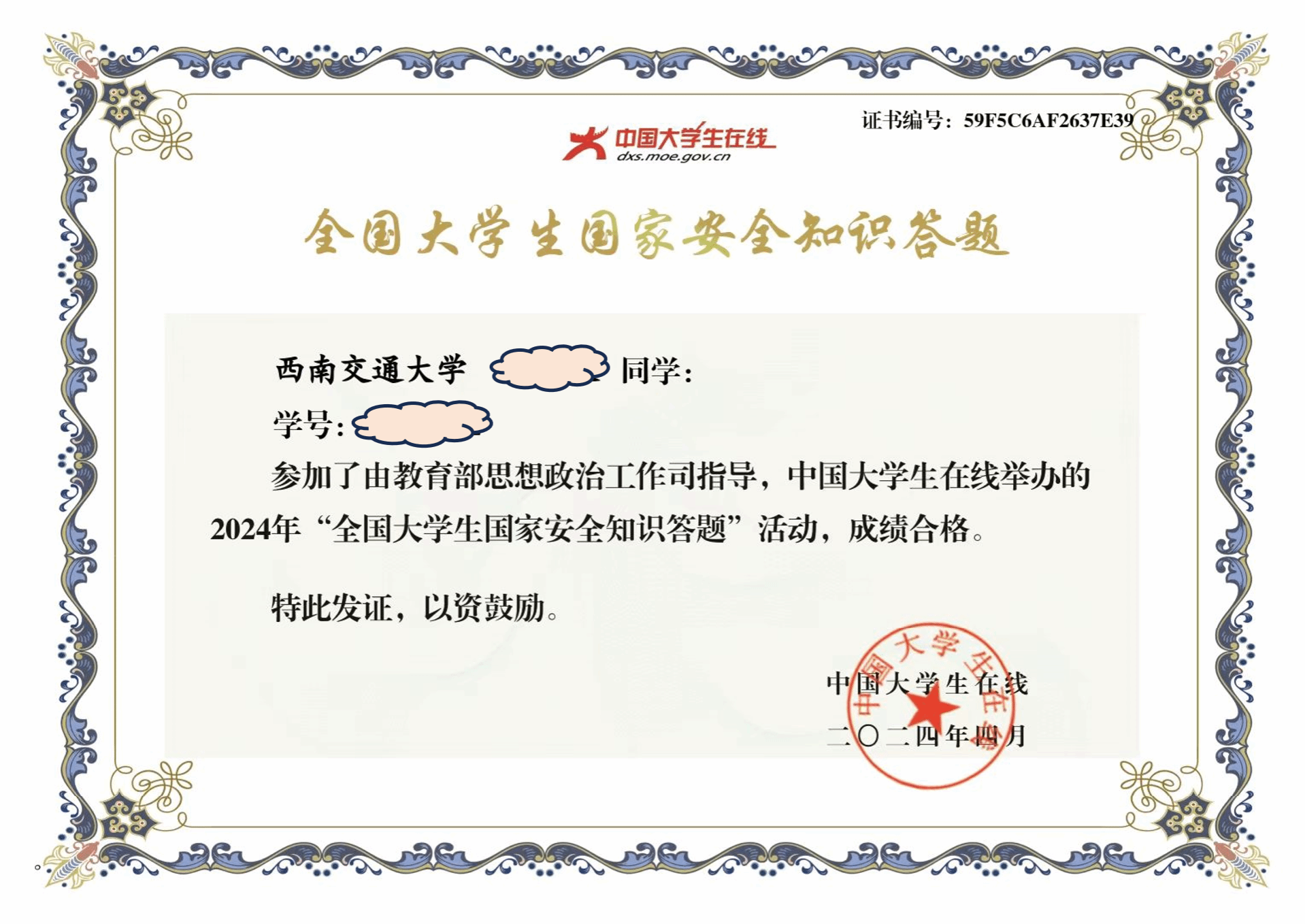 大学生国家安全知识竞赛证书