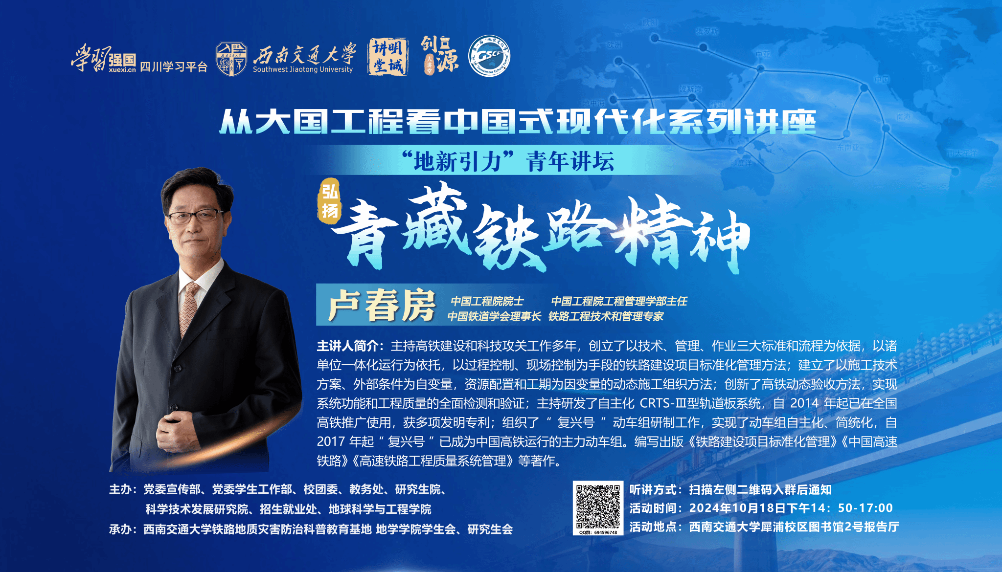为学习宣传贯彻党的二十大精神,充分发挥学校轨道交通相关学科优势,引领广大青年学生将小我融入大我,以青春实践奉献祖国,在新时代新征程中奋勇争先建功立业,使青年一代在大国工程一线受教育、长才干、做贡献。地学学院在“学习强国”四川学习平台、党委学生工作部、校团委、党委宣传部、教务处、研究生院、科学技术发展研究院以及招生就业处的支持下,邀请了大国工程一线以及思想政治教育与人文社科领域的专家、学者、教授为主讲嘉宾,通过“地新引力”青年讲坛的方式,为青年学生解惑授业、增知识、长才干,号召广大学生立志做有理想、敢担当、能吃苦、肯奋斗的新时代好青年。“地新引力”青年讲坛——“从大国工程看中国式现代化”青藏铁路精神专题讲座将于2024年10月18日举行,现就相关通知如下: