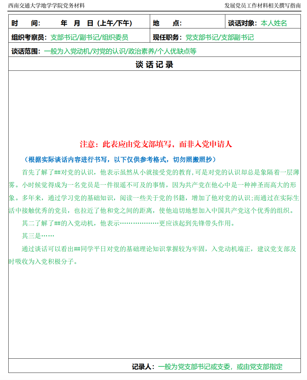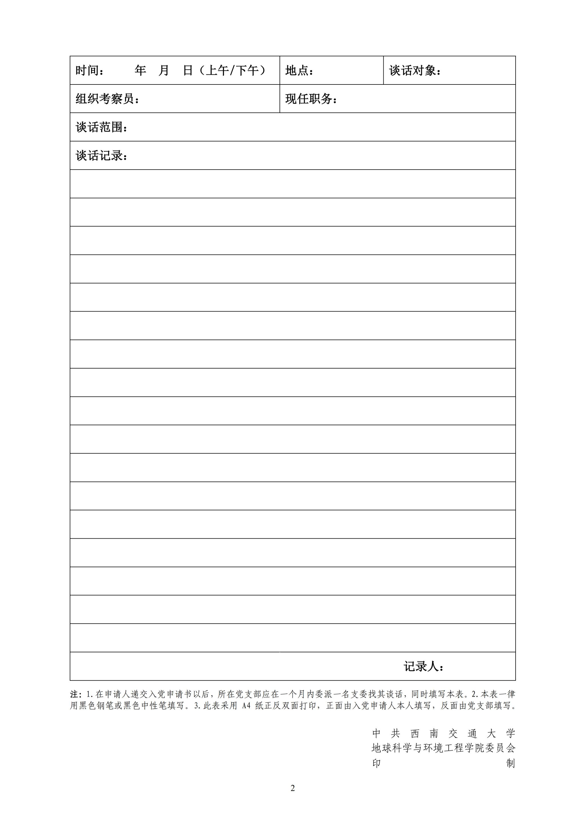 此份文件为2024年3月前使用的旧版文件,2024年3月1日及之后提交入党申请的同志请跳转链接参照新版入党申请谈话记录表: