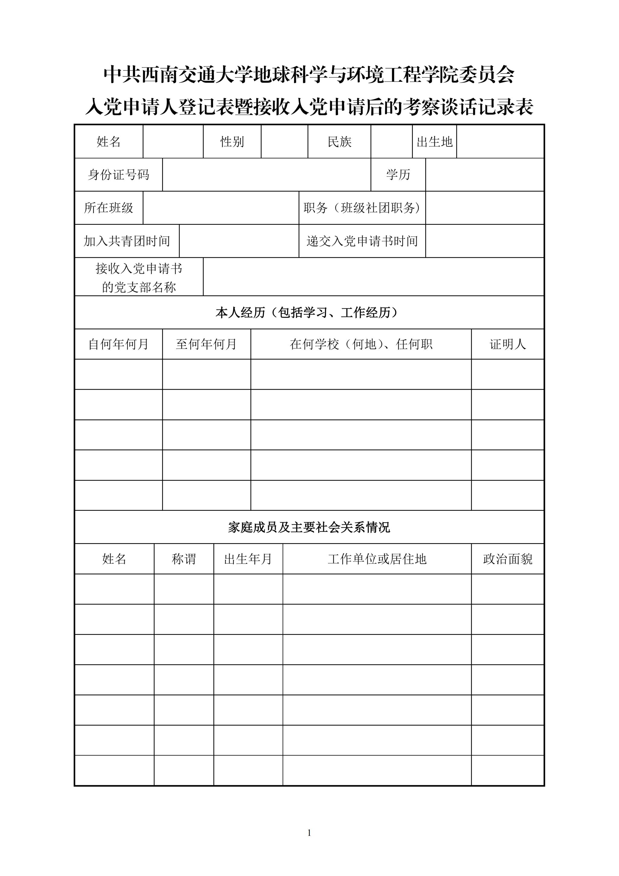 入党申请人登记表暨接收入党申请后的考察谈话记录表样例: