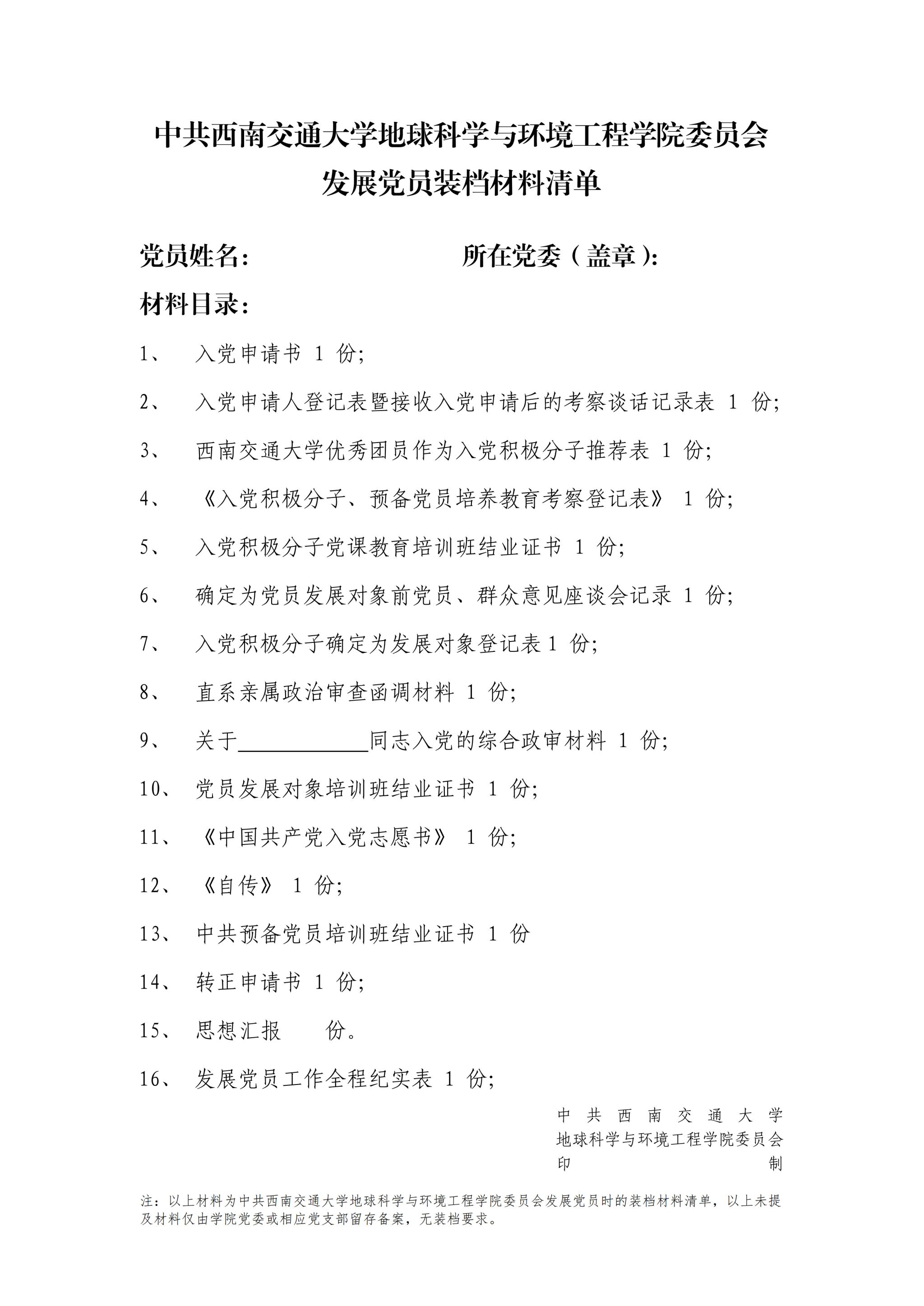 【地学版本】正式党员装档材料清单样例: