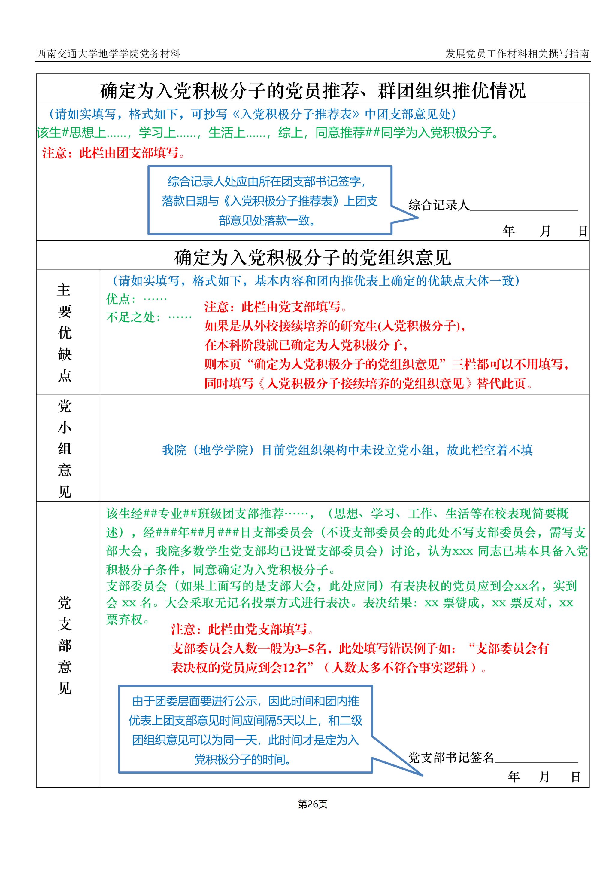 针对因升学、转专业等原因,从外校或外院转入,并非在地学学院确定为积极分子的同志,需在党组织关系转接时填写《入党积极分子接续培养的党组织意见》补充至入党积极分子、预备党员培养教育考察登记表第三页处。