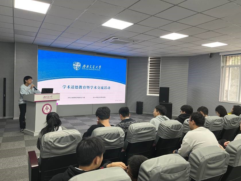最后,刘锦宇同学提出研究生应踏实诚信开展学术研究工作,正确利用文献、尊重他人成果,遵守相关学术规定。他强调了学术道德规范的重要性,作为西南交大研究生,应功崇惟志,砺行致远。此外,学术道德是建设航天强国的必要元素。