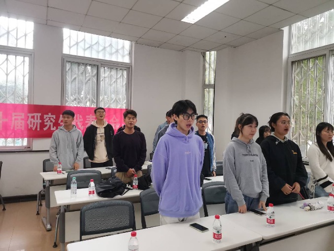 会议开始前全体起立奏唱国歌,然后崔宇龙老师进行致辞,并表达了对研究生会工作的要求和鼓励。