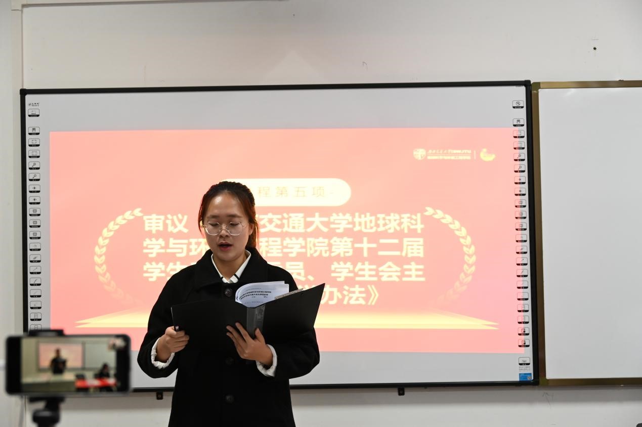 地球科学与环境工程学院第十二届学生委员会委员、第十二届学生会主席团成员选举办法(草案)》,明确学生委员会委员及主席团成员选举方式和规则流程。经各代表审议通过。