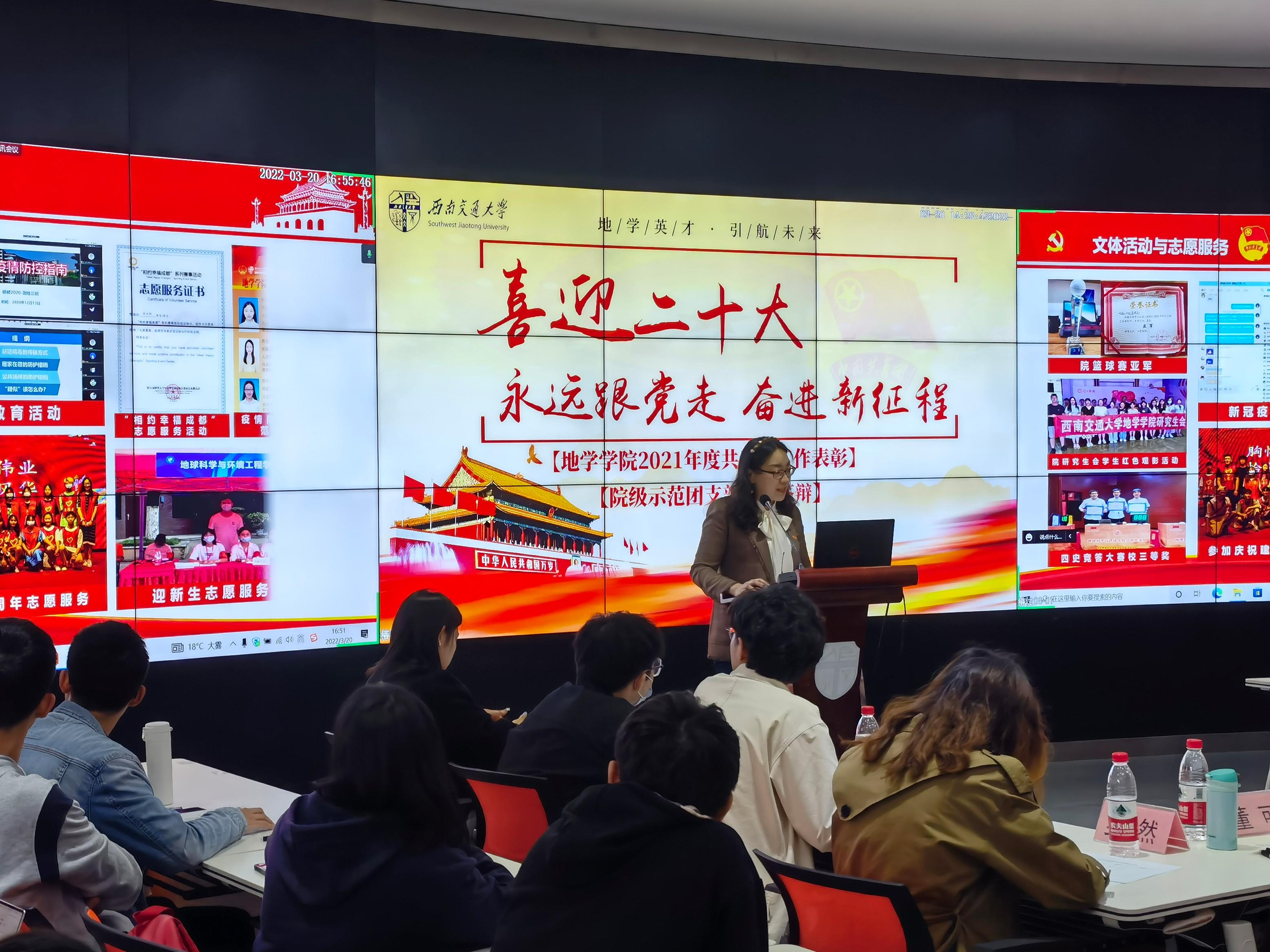 为加强团员政治教育和青年思想政治引领,提高团支部开展基础团务工作积极性,营造团支部内精勤求学的优良学风,地学学院团委于2022年3月20日在犀浦校区X4243教室举行2021年度院级示范团支部答辩会,答辩会采用线上加线下相结合的方式。地球科学与环境工程学院团委书记杨都强,院团委副书记翟琦、李婧、董可,学生园区与事务中心指导老师王琼,学习与科创中心指导老师梁爽,青年志愿者协会指导老师罗然,团建中心指导老师赵瑞涵,学生党建工作老师刘礼钊、史可心出席并担任评委,2018级、2019级和2020级本科生及研究生共10个团支部参与答辩。本次答辩会由李宝贤主持。