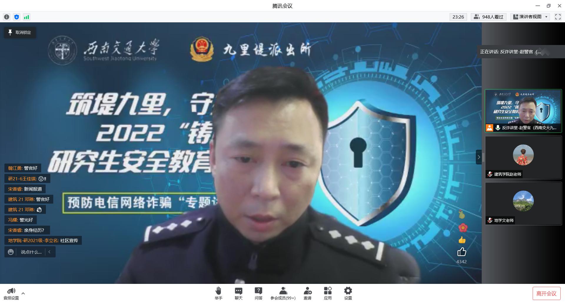 正值2022年“铸盾”研究生安全教育月,为提高研究生识别、防范诈骗的能力,增强同学们的反诈意识,3月30日下午15:00,地学学院联合牵引动力实验室、建筑学院、交运学院共同举办了“你我同心 反诈同行”——反诈防骗教育“专题讲座”。根据疫情防控需要,本次讲座通过腾讯会议线上召开,特邀九里堤派出所赵磊警官担任主讲人,地学学院全院研究生参加。