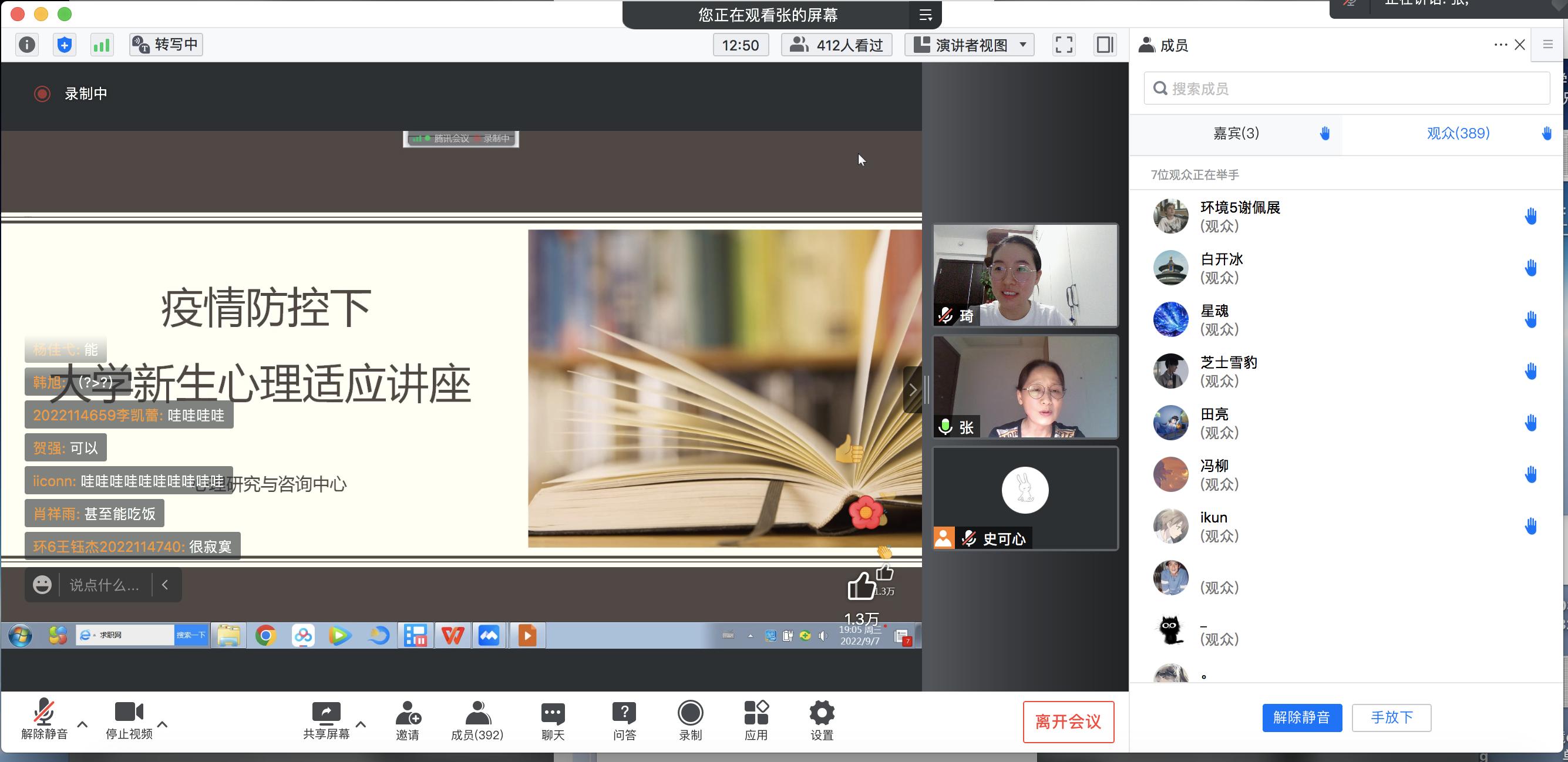 2022年9月7日19:00,为提升大学新生心理健康素养,解决同学们在生活中的困难,使同学们更好更快地适应疫情防控下的大学生活,地学学院通过腾讯会议举办了以“阳光心态,幸福人生”为主题的大学生心理健康教育讲座。本场讲座由心理研究与咨询中心的张涛老师主讲,分管学院心理工作的史可心老师主持,2022级本科生辅导员翟琦老师和2022级全体本科新生参加。