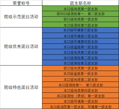 根据地学学院日前发布的《“学习二十大,青春在行动”主题实践团日活动》,经由团支部申请、学院团委初步审核、学院团委最终审核,此次主题实践团日活动获奖名单公示如下: