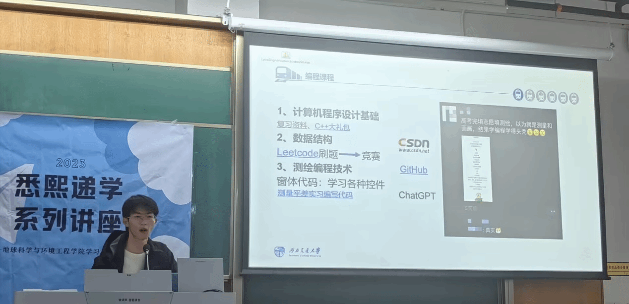 接下来付政同学就具体实践给出建议。首先应合理安排时间,养成课前预习课后复习的习惯,如此一来课堂上就会轻松不少。遇到个别上课没有听懂的知识点,课下要及时寻找优质网课资源进行再次学习。另外,课后习题的进一步练习能帮助同学们更好的掌握知识点。付政同学强调大一大二阶段《高等数学》《线性代数》《大学物理》等公共课程对于接下来的专业课程学习非常重要,同学们务必要打牢基础。介绍完学习的方法后,付政同学又向同学们分享了一些有关竞赛的心得,也推荐了许多适合地学学生的国家级竞赛。他通过自己的亲身经历强调了竞赛过程中编程能力的重要性,希望同学们拓宽知识领域,提升综合能力。最后,付政同学寄语低年级同学:“保持好奇,终身学习。”