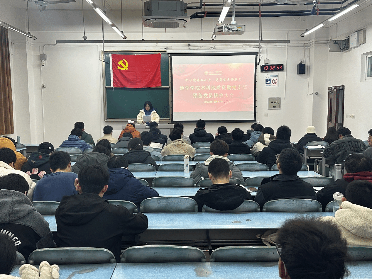 2023年12月8日19时30分,地学学院本科地质资勘党支部在X2220教室顺利召开预备党员接收大会,本次大会的议题:讨论是否同意接收刘宗旭、杨晨、林星杰、乔彦博、赵高伟、李骁群、王国英、廖望和朱梓宁9名同志为预备党员。会议由党支部书记薛怡然同志主持,支部正式党员应到会10人,实到会8人。