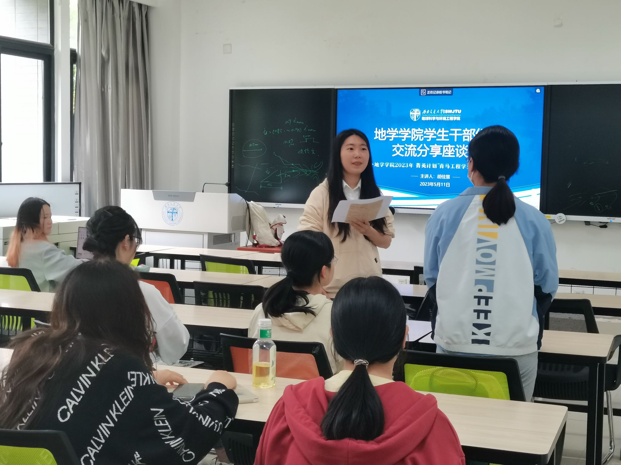 在讲座期间,培训班开设一次专题座谈,由地学学院学生会主席胡佳慧、张绪明、黄泳桦分别与所对接团学组织推荐的培训班学员对坐畅谈,针对不同学员工作中遇到的难题分享各自经验,鼓励同学们合理调度学院资源,灵活运用方式方法,及时与所在组织主席或者学院学生会寻求帮助,尽早解决问题。