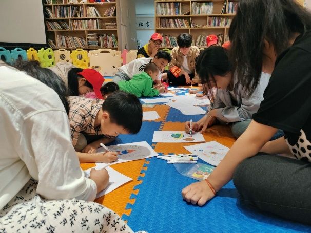 首先,两名志愿者为小朋友绘声绘色地讲解故事,带领儿童体会阅读的快乐。随后由一名志愿者带领小朋友进行宇宙星空主题绘画活动。最后,在负责人的带领下,我们进行了本次活动的总结会议,提出了建设性的意见。