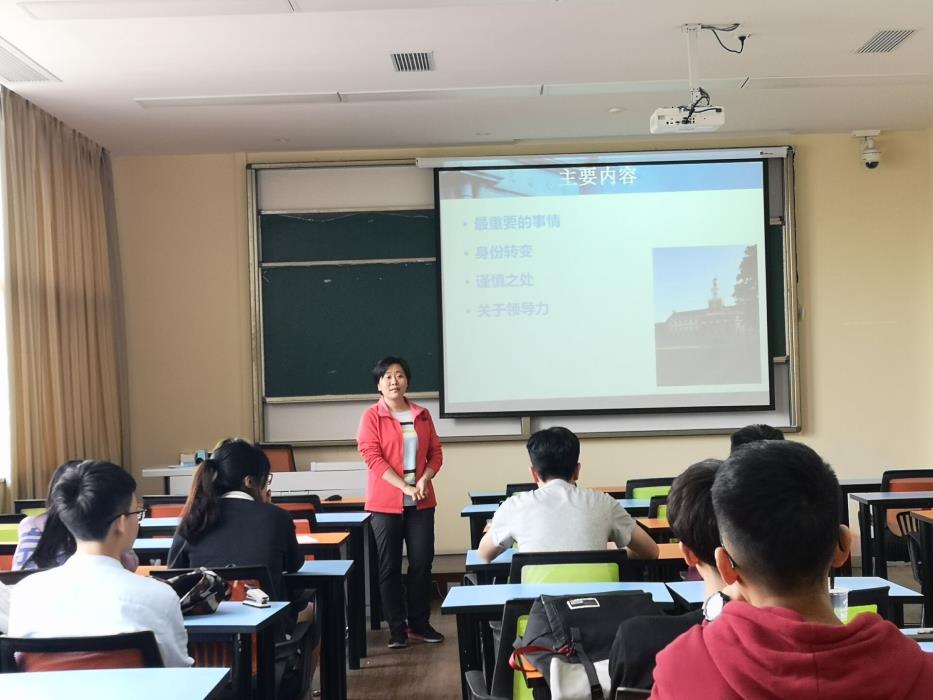 周青老师首先针对学生干部的身份认识及培养目标,主要讲了四个方面内容:作为学生干部“最重要的事情”、“身份转变”、“谨慎之处”、“领导力”。她通过介绍自己学生时代班级的成功活动,讲到班级干部举办活动凝聚班级向心力的重要性和使同学之间增进了解的重要性。