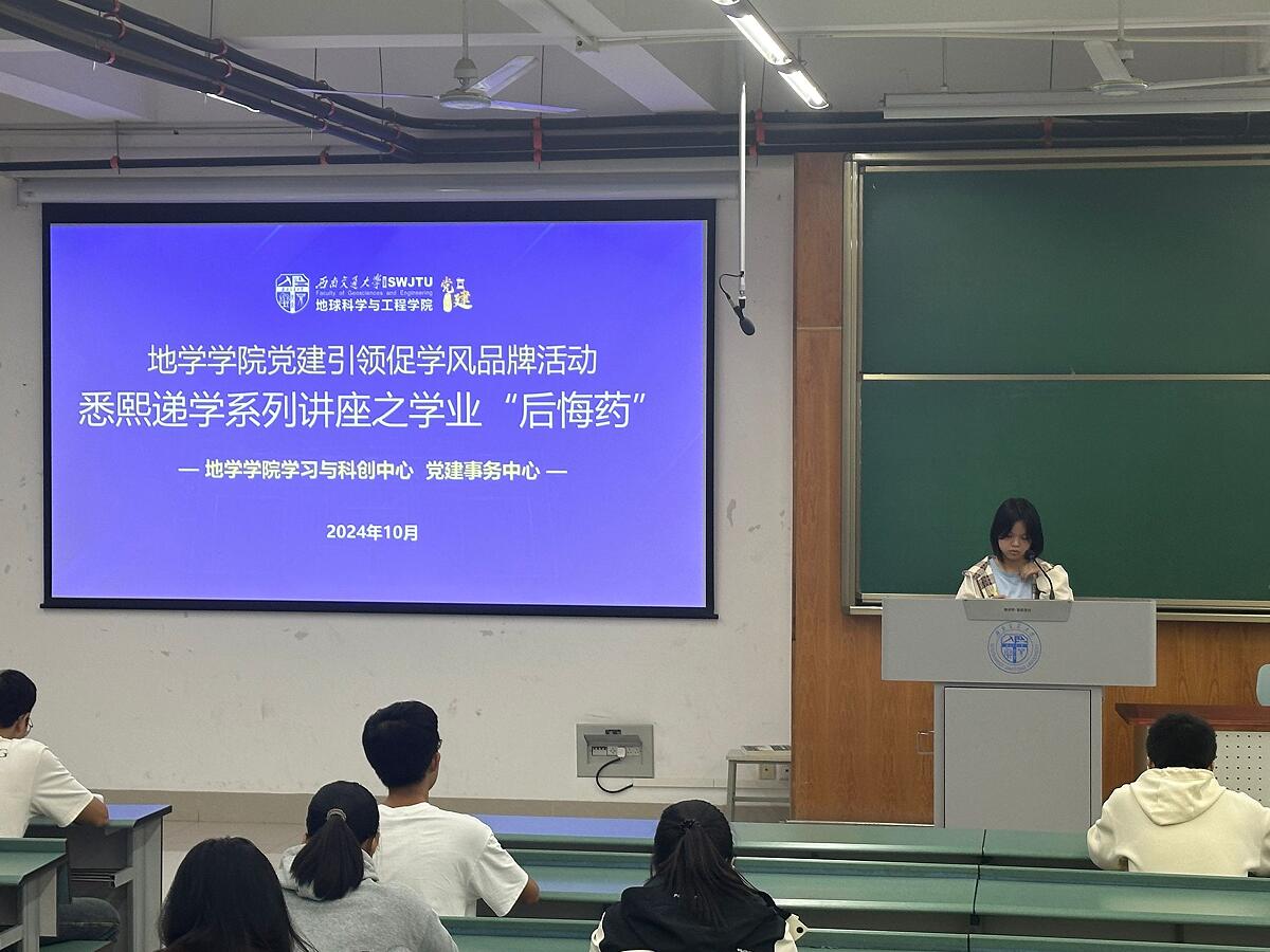 为全面学习贯彻习近平新时代中国特色社会主义思想和党的二十大精神,奋力书写为中国式现代化挺膺担当的青春篇章,促进地学学子学风向上向优,地学学院学习与科创中心于10月31日晚在X4352教室举办悉熙递学系列讲座第2场—学业“后悔药”学业生涯规划讲座。本次讲座特邀优秀学生代表——21级资源勘查工程徐嘉茜、21级测绘工程彭路鹏为主讲人,结合“大学期间关于学习最后悔的事”这一主题,为同学们呈现一场有趣且内容丰富的学业规划主题讲座。