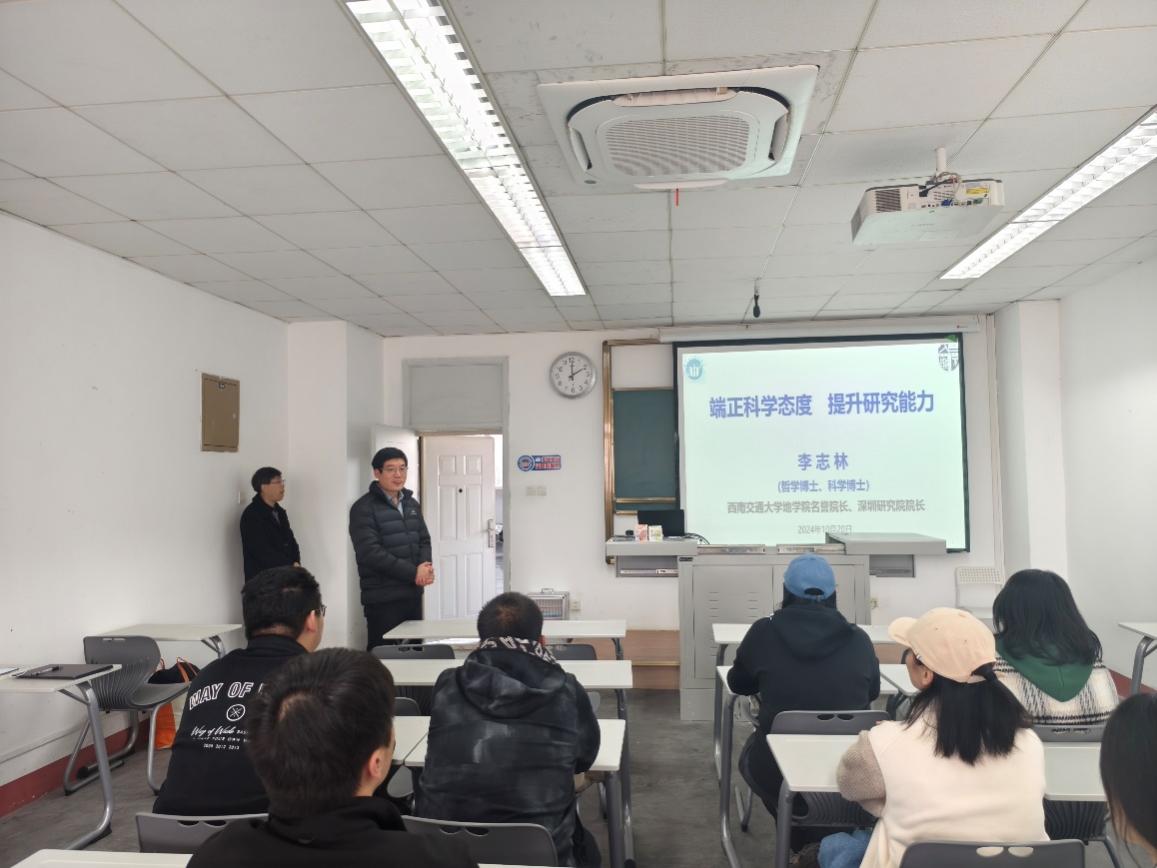 为加强研究生的学术规范与道德教育,帮助2024级硕士新生尽快适应角色,11月28日下午,地学学院2024级地质类硕士研究生学术素养提升专题分享交流会在九里校区J4609B教室顺利举办。本次分享交流会邀请了地学学院创院院长、名誉院长李志林教授和学院副院长赵晓彦教授主讲。