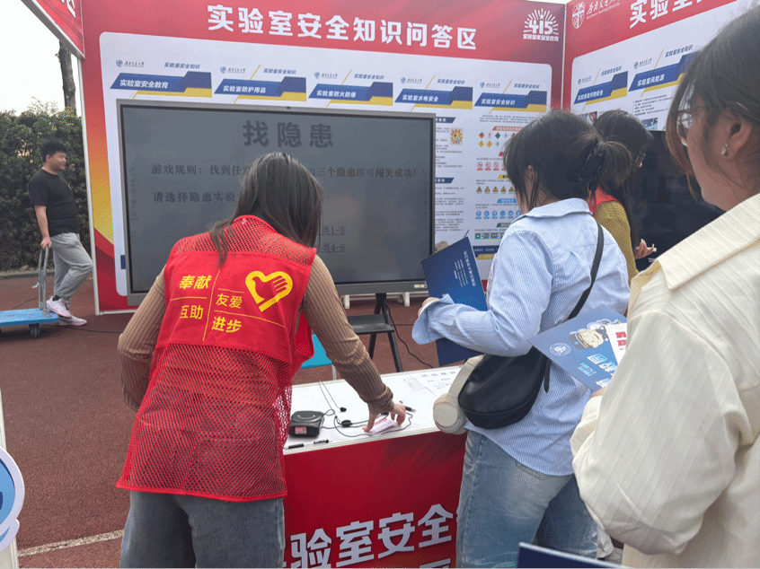 在 “实验室安全知识问答区” ,师生们通过实景“找隐患”,沉浸式识别并发现实验室安全隐患,系统还会实时生成 “安全评分”,并贴心给出针对性的改进建议。