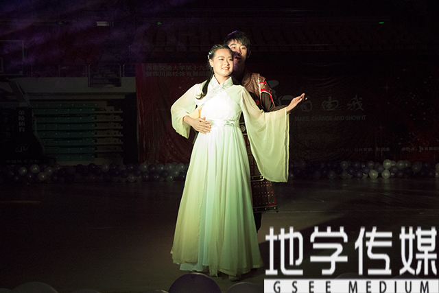 随着一曲悠扬的《美丽的神话》飘入观众的耳朵,地学学院代表队上场了,男生的铠甲彰显着阳刚之气,女生的长裙显露了娇柔妩媚。这段唯美的爱情故事被他们完美地演绎。当战争的号角霎时间吹响,男子汉们英勇赴战场,他们纵有再多的不舍也难置国家危亡于不顾。铮铮号角吹出了对国家的无限忠诚,依依不舍道出了感情的绵延悱恻。当音乐再一次回到了舒缓,一切归于平静,男女热烈相拥更是将情感的主线拉到最高点。场上更是响起经久不息的掌声。