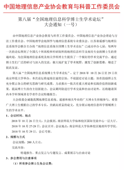由中国地理信息产业协会教育与科普工作委员会、中国地理信息产业协会理论与方法工作委员会、中国地理学会地图学与地理信息系统专业委员会、江苏省遥感与地理信息系统学会联合主办的“第八届地理信息系统全国博士生学术论坛”拟于10月26-29日在南京师范大学召开,仍然采用免注册费、免食宿、赠专业书籍等活动。麻烦各位老师将该通知转发给贵校的有关导师及博士生,并鼓励大家积极参会。谢谢!