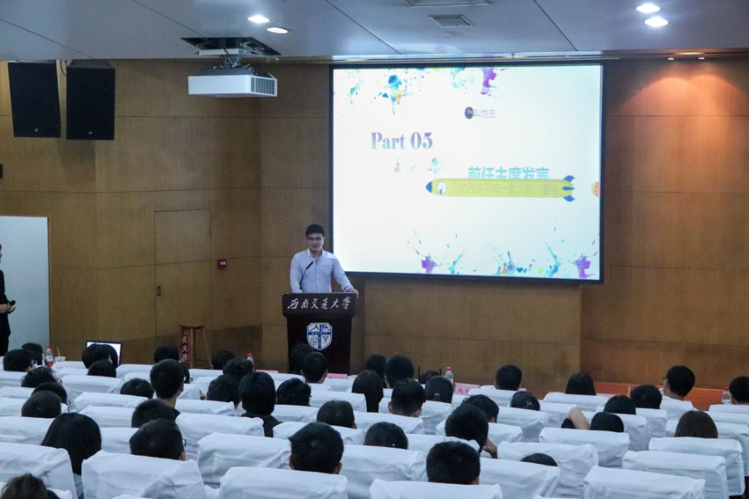 奏唱国歌过后,便是嘉宾发言环节。学生会指导老师-李国欣老师、前任学生会主席-郝建龙主席、现任学生会主席-高颖主席分别上台,并表示自己对这届学生会全体成员充满了信心,希望学生会的每一位成员不仅能在学生会里面学到能力,还能处理好工作与学习之间的关系,不要让自己留下遗憾。李国欣老师提到了在大学要始终保持“三心”:用心、热心、崭新。我们要用心地完成自己手边的每一件事,在待人处事时要时刻保持热心,永远要以一个崭新的面貌面对未来。