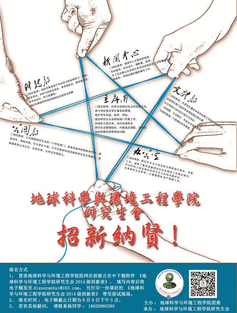 江山代有才人出,各领风骚数百年。在此开学之际,地球科学与环境工程学院研究生会又将开展一年一度的招新工作。具体事项如下: