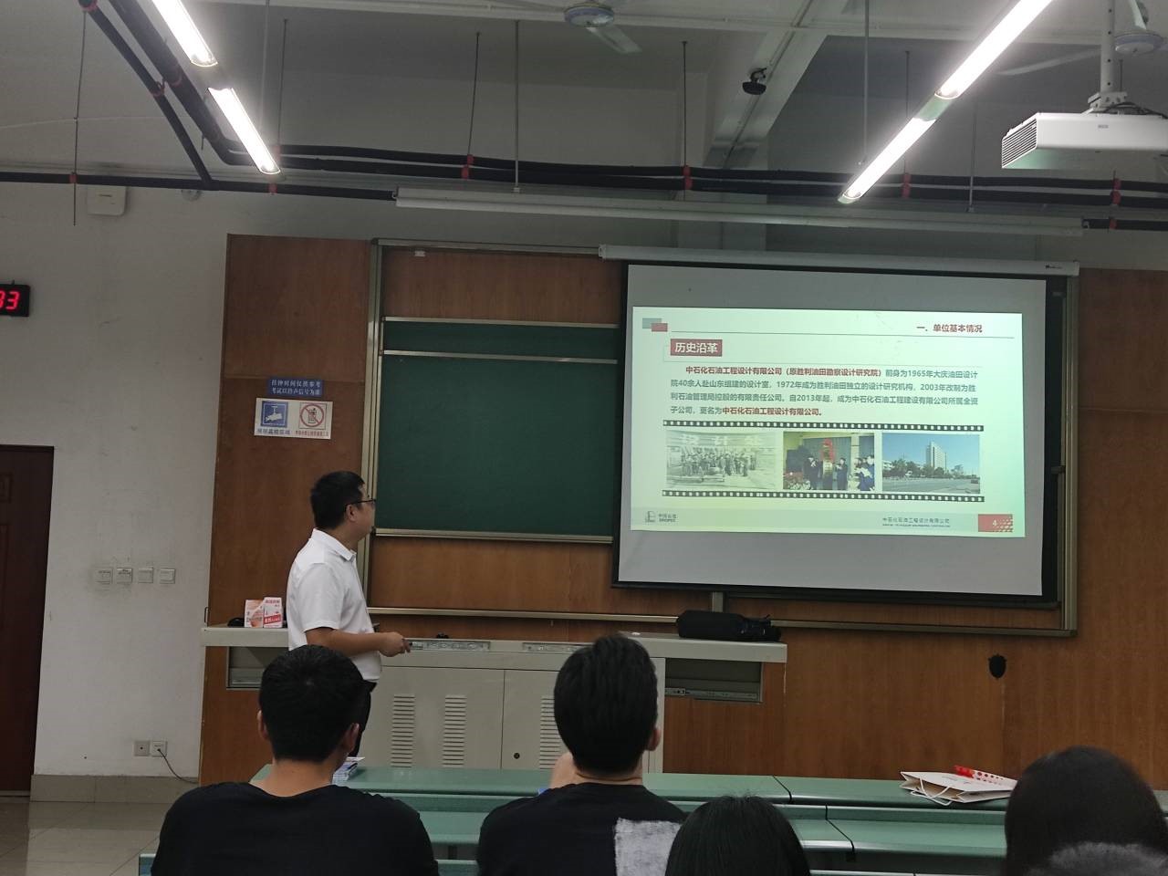 中石化石油工程设计有限公司首先介绍了公司的基本情况,包括公司的历史沿革、分子公司和联络点分布、市场范围、工作环境和技术实力等。然后介绍了公司的人才队伍,员工队伍素质较高,高端人才集聚以及较高的薪酬福利待遇。同时,也向在场同学介绍了公司的招聘要求、应聘流程及联系方式等,现场同学反响热烈。
