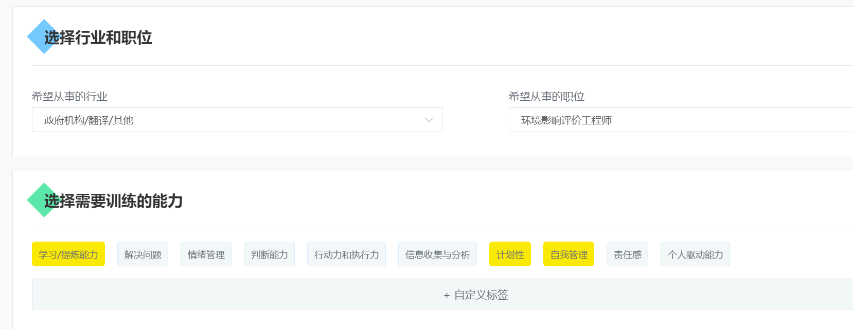 注意:在选择行业和职位版块可以根据自己的兴趣、专业等进行选择,也可自行选择需要训练的三项及以上的能力.