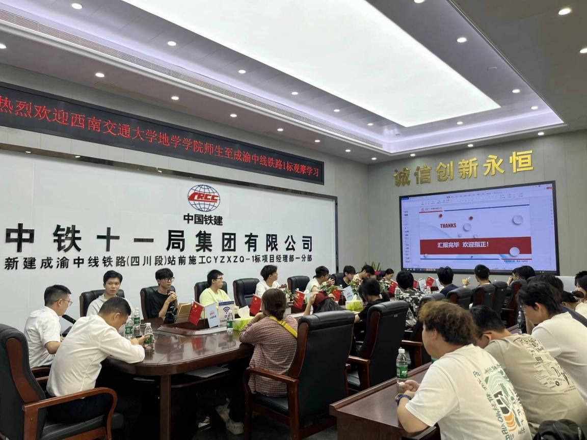 青年志愿者协会李心悦:参观中铁十一局成渝中线铁路项目部,让我见证了现代高铁建设的智慧与力量。精细化管理、智能化施工,自主研发,在复杂地质条件下推进工程,彰显了中国基建的实力与担当。项目部经理、总工程师与地学学院学生干部交流分享经验,将理论知识与实际施工相联系,让我们更清楚的认识到身上的责任与担当,努力学习专业知识,为国家基建事业贡献力量!