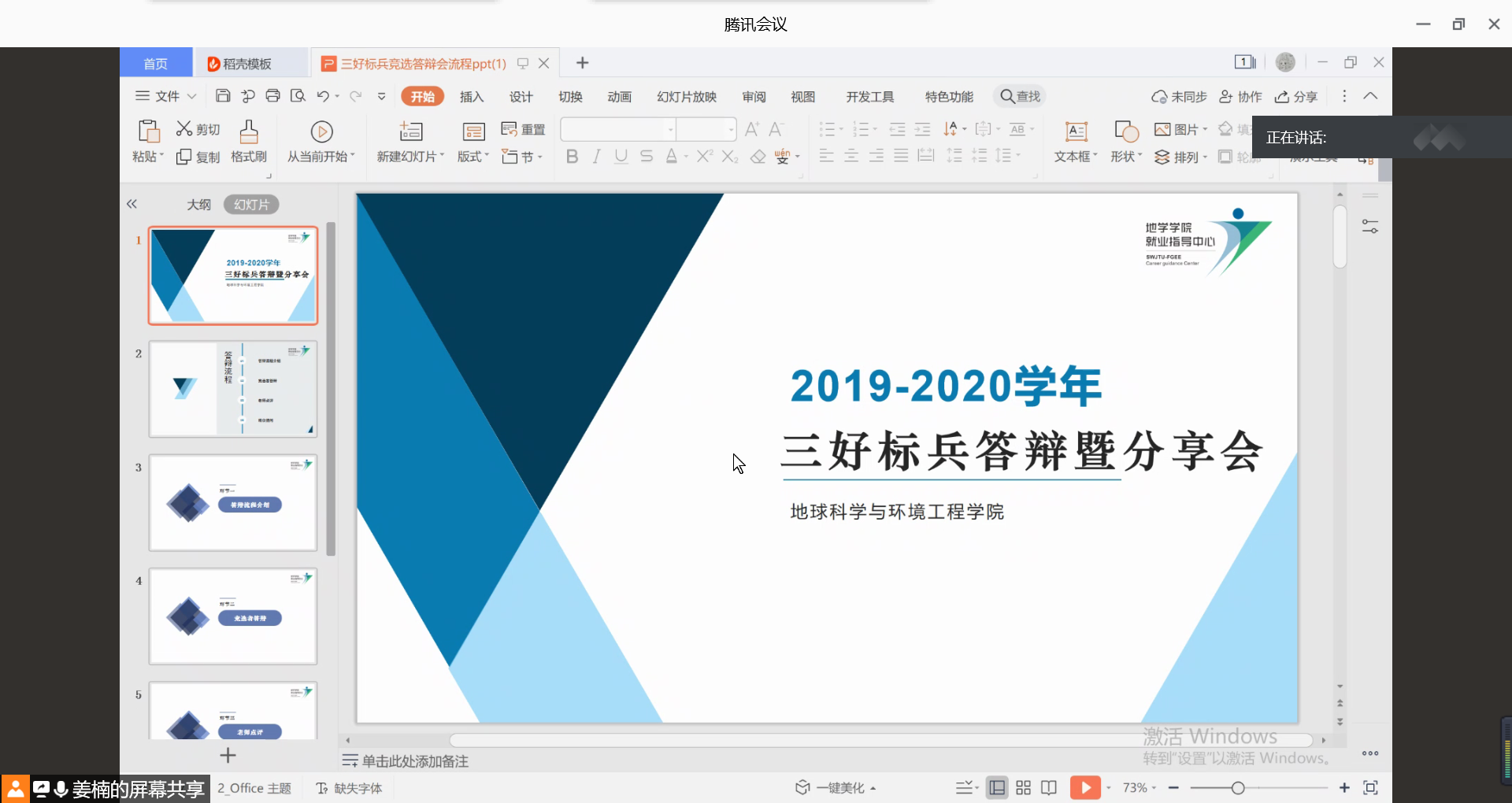 2020年10月9日13时,地球科学与环境工程学院就业指导中心成功举办“2018级环境、安全工程专业2019-2020学年三好标兵答辩暨分享会”。本次活动由环境工程专业的姜楠同学主持,地学学院2018级辅导员、就业指导中心指导老师杨都强老师出席指导,活动通过腾讯会议线上开展,活动吸引到71名各年级观众听会学习。