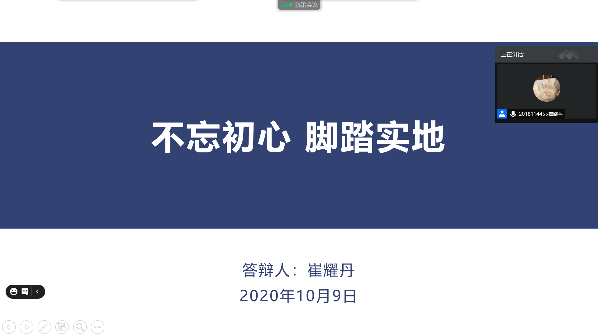 首先第一位答辩者,来自环境2018-01班的崔耀丹同学,她以“不忘初心 脚踏实地”为此次答辩的主题,结合其自身思想基础、学习科创、学生工作、实践活动及文体活动等优势,充分展现出良好的学生风貌和思想觉悟。崔同学在答辩中提到“我们要向习近平主席所说的,作为新时代的青年,要按照党和人民的要求锤炼自己,提高自己,做到志求高远、德才并重、情理兼修、勇于开拓。” 希望同学们也能在火热的青春中放飞人生梦想,在拼搏的青春中成就事业华章。