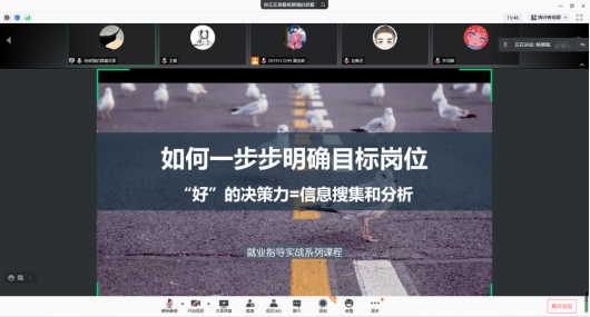 2020年12月22日21:30,地学学院就业指导中心“女生职业成长训练营”系列活动第三期——“职业规划——如何一步步明确目标岗位”讲座在腾讯会议顺利举行。为积极响应学校防疫政策与要求,本次活动以线上会议的形式开展。活动由就业指导中心郑文娇老师主持,特邀杨都强老师主讲。