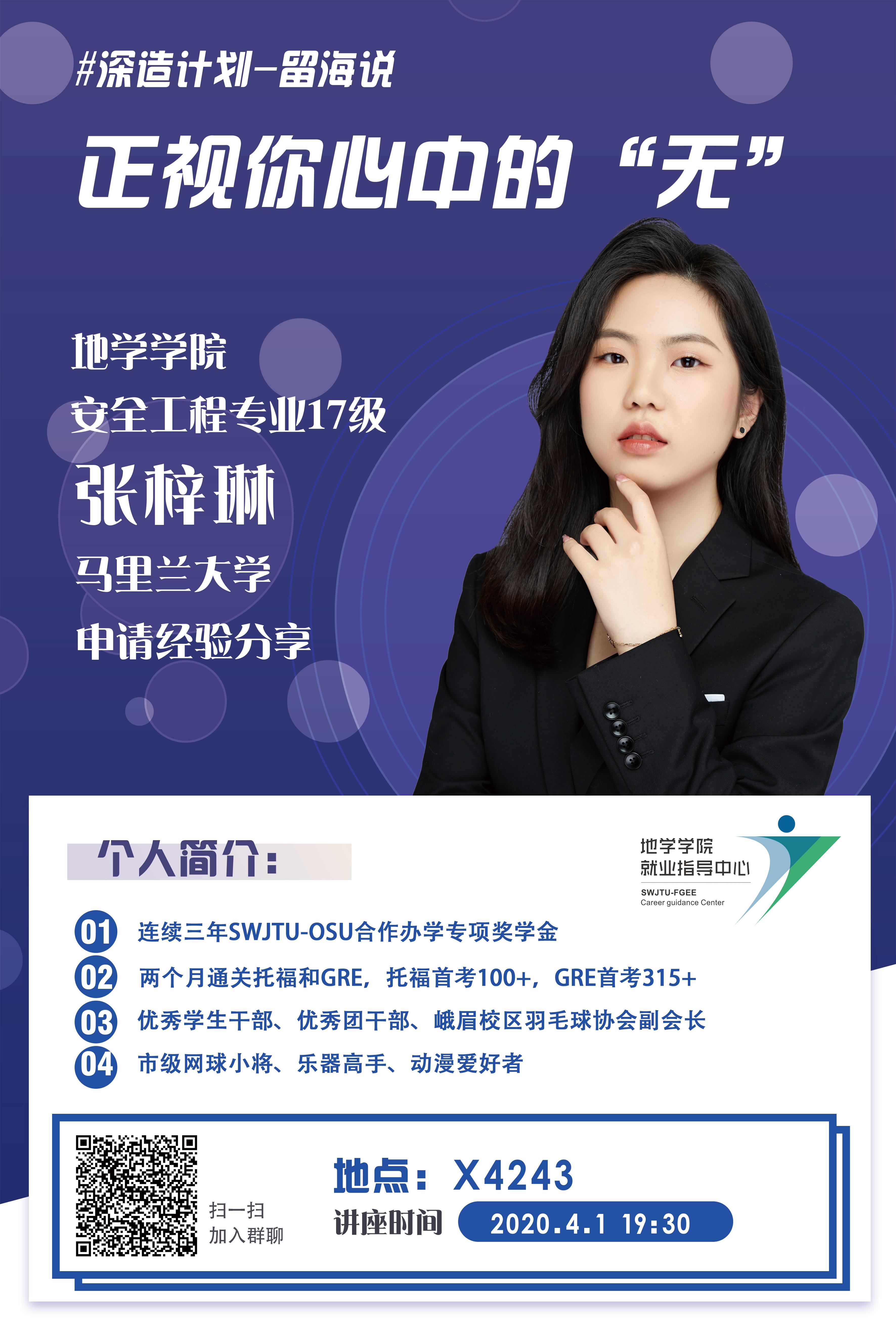 主讲人简介:地学学院安全科学与工程类大四在读。曾连续三年获得SWJTU-OSU合作办学专项奖学金,两次获得优秀学生干部,一次优秀团干部,除此之外还获得校级羽毛球赛奖项若干,曾任峨眉校区羽毛球协会副会长。她曾两个月通关托福和GRE;托福首考100+,GRE首考315+;无中介,自己DIY包办申请;获得了马里兰大学的offer。不仅如此,她的兴趣爱好还很广泛;她爱看动漫,打网球,听音乐,还曾经获得乐器比赛国家级奖项。