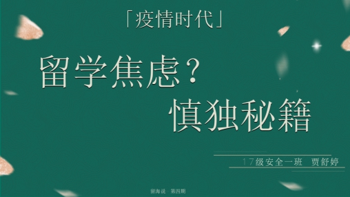 就业指导工作实效。本期讲座特邀地学学院安全工程类专业大四在读优秀学姐贾舒婷主讲,主题为“解决‘后疫情时代’的留学焦虑—慎独秘籍分享”。