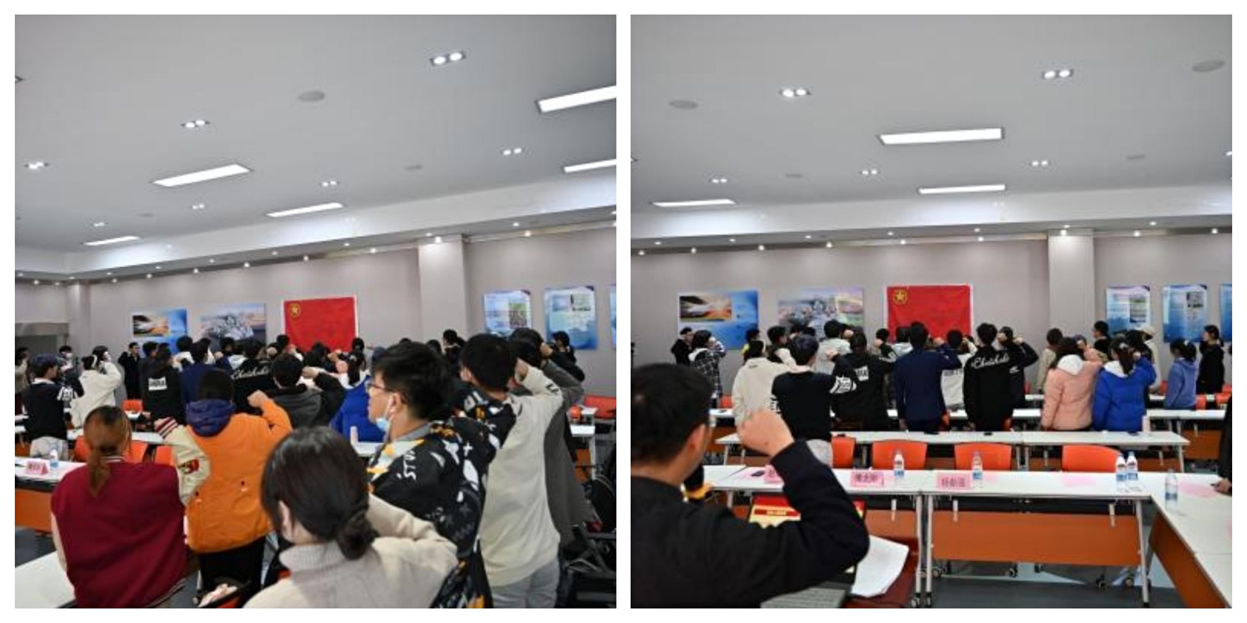 在团课尾声,杨都强老师带领全场同学们面向团旗,重温入团誓词,在场的同学们全部举起右手,在团旗下宣誓“我志愿加入中国共产主义青年团,坚决拥护中国共产党的领导,遵守团的章程,执行团的决议,履行团员义务,严守团的纪律,勤奋学习,积极工作,吃苦在前,享受在后,为共产主义事业而奋斗”。通过重温入团仪式,不仅让全体参培学生干部再次经历了思想上的洗礼,更加坚定了学生干部们为同学、学院以及学校服务的决心,也让同学们领悟了爱党爱国主义精神的深刻内涵,激发了全体学生干部作为党的后备军、国家的未来的光荣感与使命感,在今后的学习生活中也必将更好地引领身边同学成为能当之无愧挑起中华民族伟大复兴历史伟业重担的新时代优秀大学生。