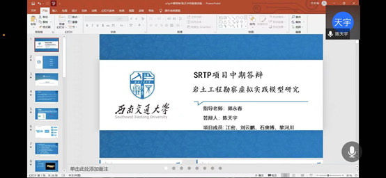 答辩总结:在本次答辩过程中,该小组向评委老师们展示了前期研究成果,但由于疫情影响,野外数据采集未能按期完成。根据该小组的展示内容,评委老师提出了关于地质雷达结构与实验地选择等问题,项目成员也通过这些问题深化了对研究项目的认识。
