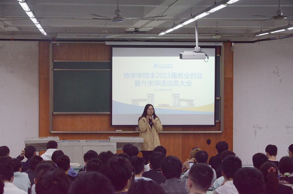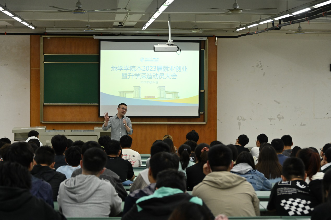2022年4月14日下午,地球科学与环境工程学院于X4350召开本2023届就业创业暨升学深造动员大会。动员大会共包括四项流程:学院党委副书记傅尤刚就本科升学与就业工作作动员讲话;学院副院长朱军就学院研究生教育与培养作发言;学院负责升学深造的辅导员翟琦老师介绍学院近几年升学深造情况;2023届辅导员老师李婧就学生考研与就业给与具体建议。地学学院本2023届辅导员老师何杨、李婧及全体学生参加动员会,翟琦主持动员会。