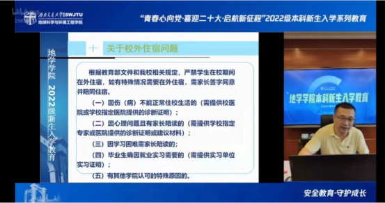 9月22日,地学学院通过网络直播顺利开展2022级新生入学教育之安全教育暨入党启蒙教育。本次入学教育由地学学院党委副书记傅尤刚、党建事务中心指导老师文强分别讲授,辅导员老师翟琦主持,本2022级全体新生参加。