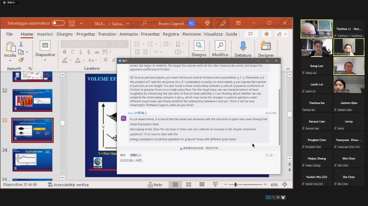 Cagnoli教授首先介绍了高速远程滑坡这一特殊的大规模、高致灾性的地球物理颗粒流的非稳定、竖向稀疏化、侧向受限等特性,并结合滑坡研究先驱Albert Heim于1932年提出的滑坡体积效应(volume effect),引出了高速远程滑坡流动性这一国际滑坡动力学领域悬而未决的科学问题。