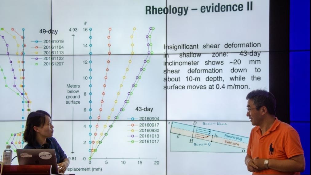 在报告中,胡燮研究员首先从合成孔径雷达干涉测量技术(InSAR)的基本概念出发,介绍了如何使用InSAR提取高精度时序地表形变和覆盖变化信息,并用于滑坡等地质灾害研究。胡燮研究员以美国科罗拉多州西南部缓慢移动的Slumgullion滑坡为例,该滑坡以日均1-2厘米的速度已持续运动了约300年,目前运动距离长达4000米,被誉为“研究慢速滑坡动力学的天然实验场”;介绍了如何通过基于机载UAVSAR和星载Sentinel-1所获取的数据,并结合合成孔径雷达干涉测量和像素偏移追踪(InSAR-POT)方法来获取该滑坡表面的高精度形变细节;研究发现自1991年以来,该滑坡向下滑动了近40-50米;提取分析滑坡后缘到滑坡趾间77个横剖面的纵向滑移速率,发现滑移速率最大的区域为滑坡中部较窄区域,滑移速率可达14 mm/day;在此基础上通过引入非牛顿流体指数模型,反演了该滑坡滑面的空间几何形态特征、各个横剖面的滑移速率以及滑坡表面的四维运动特征。