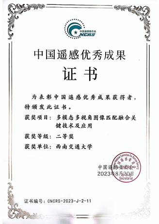 地球科学与环境工程叶沅鑫老师课题组主持的“多模态多视角图像匹配关键技术及应用”成果获得了2022年度中国遥感优秀成果二等奖,中国遥感委员会在大会上颁发了获奖荣誉证书。